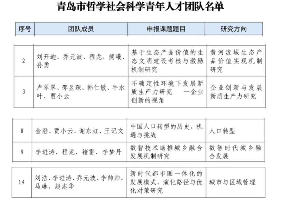 近日,青岛市社会科学界联合会公布“青岛市哲学社会科学青年人才团队”名单。山东大学公共治理研究院研究员作为团队负责人和主要成员申报的2项课题入选团队立项。其中,金澄作为团队负责人,贾小云、谢东虹等作为团队主要成员申报的《中国人口转型的历史、机遇与挑战》入选团队立项;李进涛作为团队负责人申报的《数智技术助推城乡融合发展机制研究》入选团队立项。